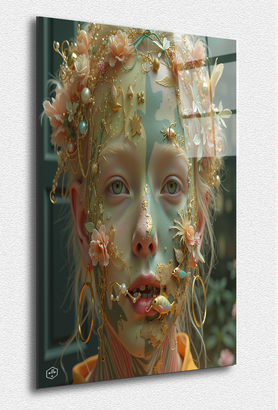« Roussette » is an enchanting portrait of a young girl whose skin is adorned with intricate pastel tattoos. Roses and pearls blend seamlessly with her complexion, while golden animal-shaped jewelry sparkles against her delicate features. Her serene expression and luminous colors evoke a sense of ethereal grace.